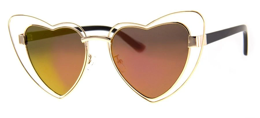 Double the love with these heart shaped metal sunglasses. Pink mirrored lenses with gold frames. Injection mold plastics and metals. UV 400 lens protection with impact resistant lenses.