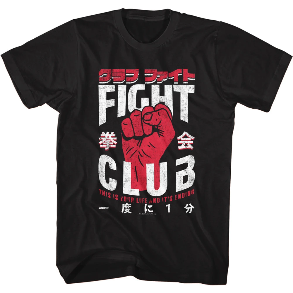 Officially Licensed Fight Club tee. “This is your life and it’s ending”. A nod to the 1999 film classic by David Fincher. Features a movie poster with kanji characters on a standard black tee.