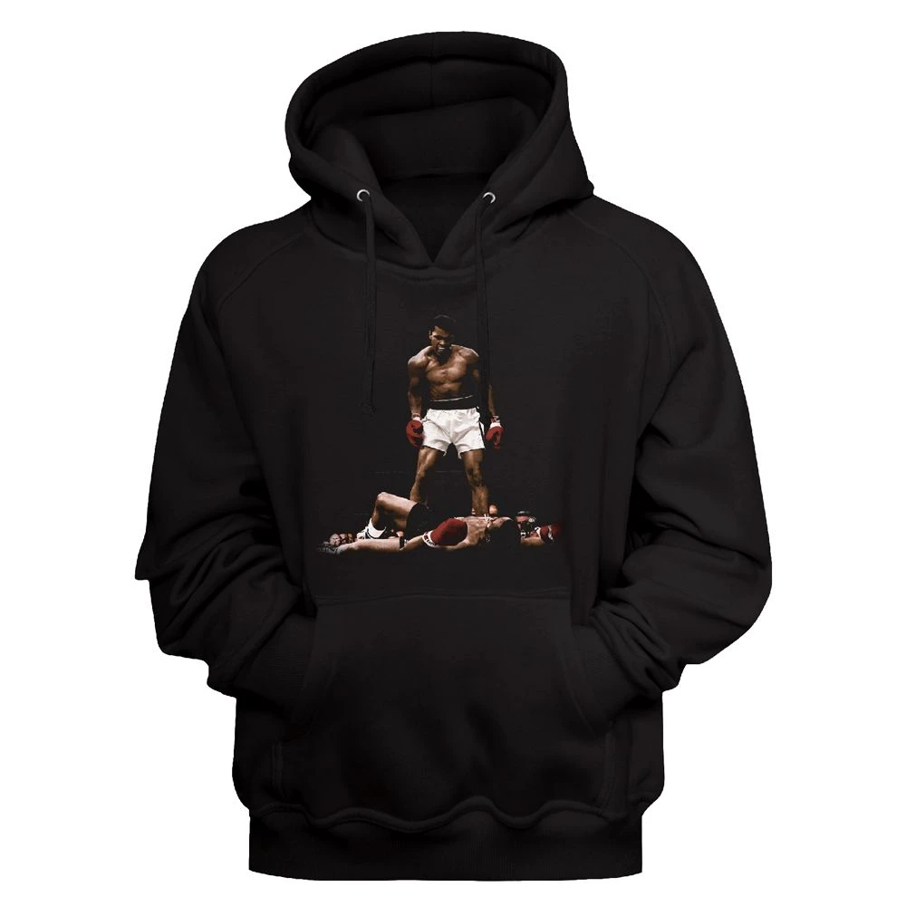 Officially Licensed Muhammad Ali hoodie. Features the stunning knock out of Sonny Liston during the legendary boxing match of 1965. Standard fit fleece hoodie with pouch pocket and solid rib trims.
