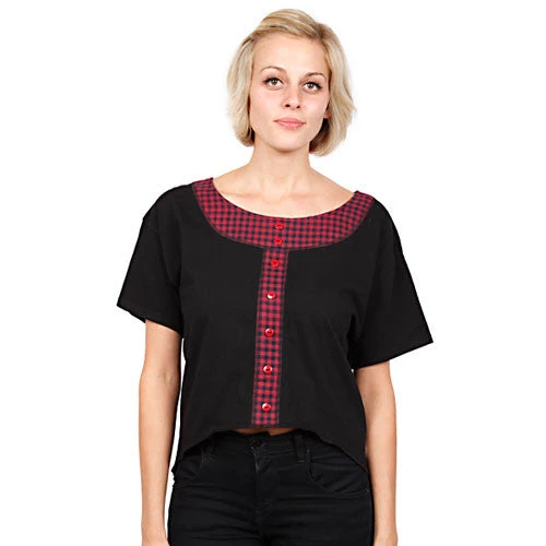 Cropped scoop neck top with detailed hem. Plaid fabric pattern with novelty buttons.