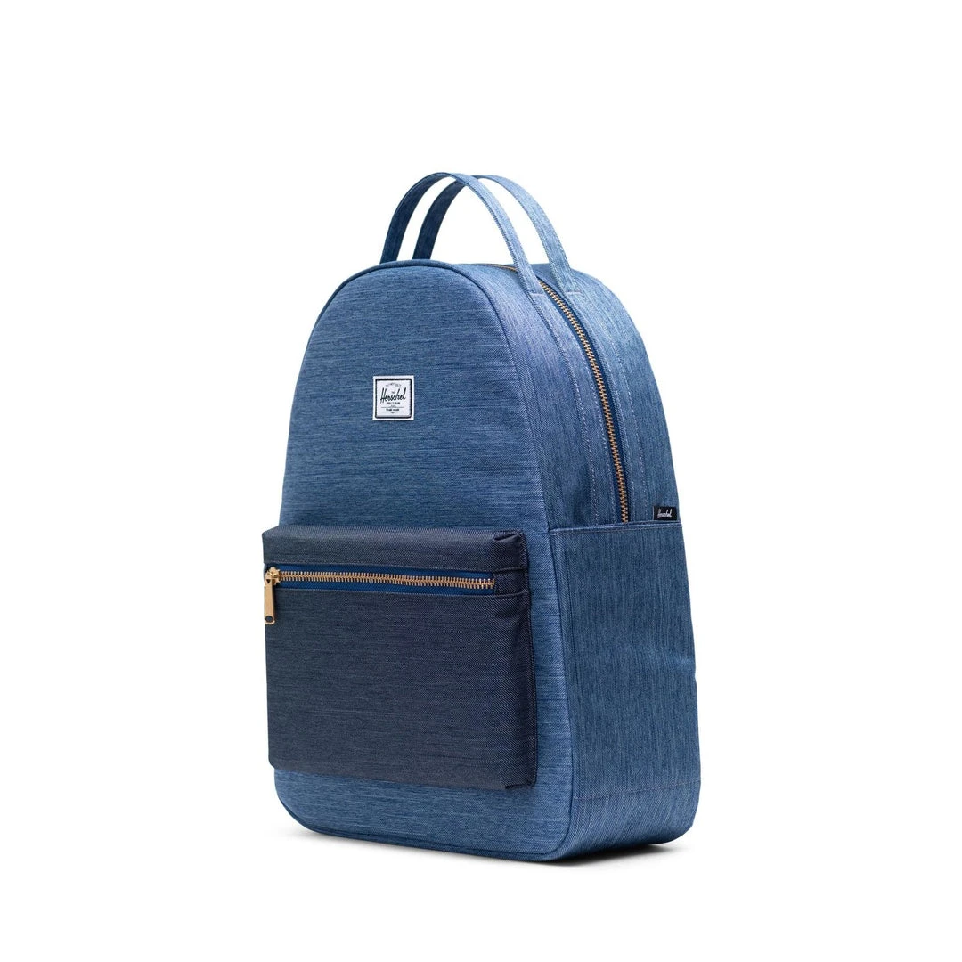 Herschel Nova Mid Volume backpack in denim. Classic compact backpack with dual carrying handles Signature striped fabric liner and dual water bottle pockets. Spacious main compartment for everyday essentials. Internal 13″ laptop storage sleeve and front pocket with key clip.