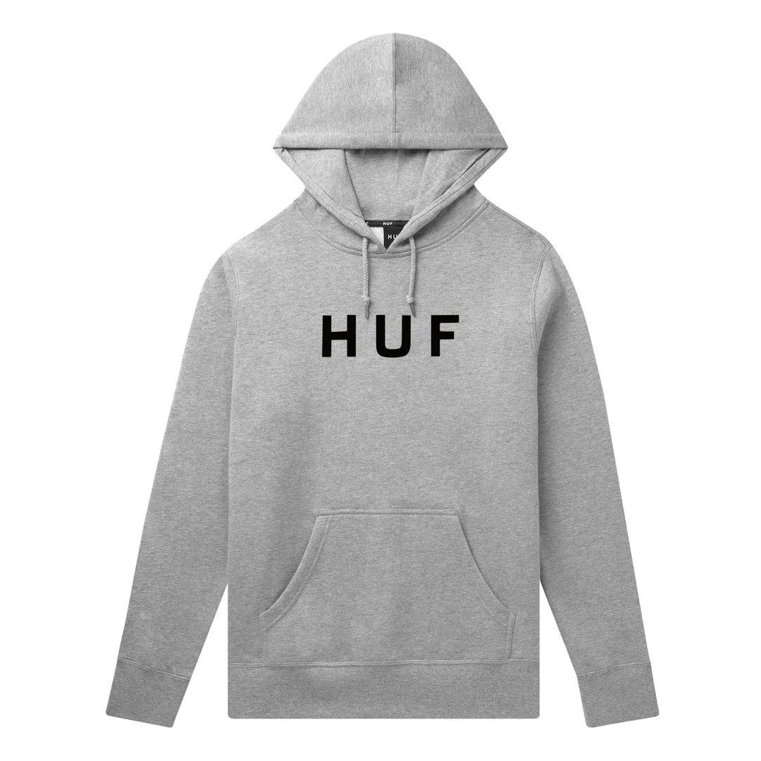 HUF Essentials OG Logo hoodie in grey heather. Pullover hood with clean screenprinted front.