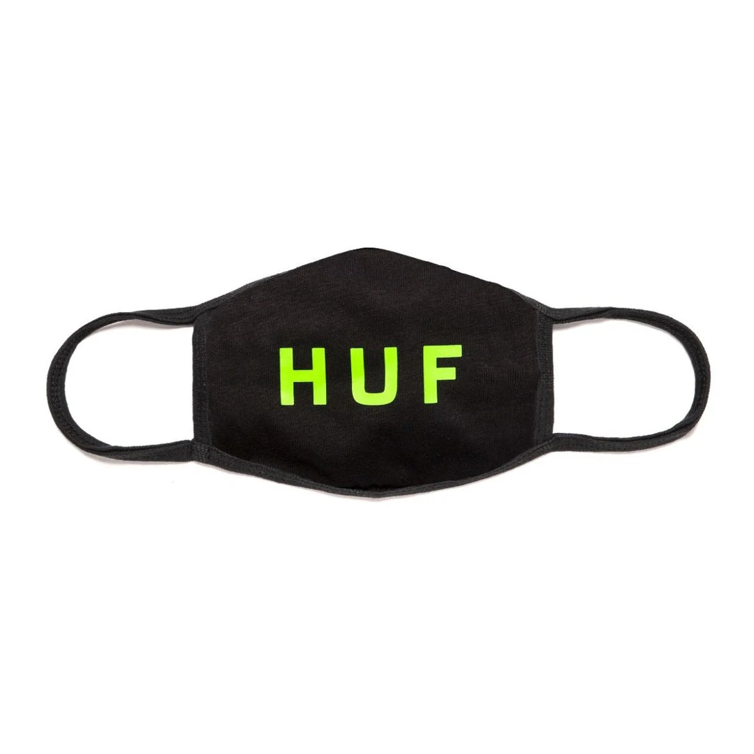 Black cotton mask with neon green HUF OG logo.