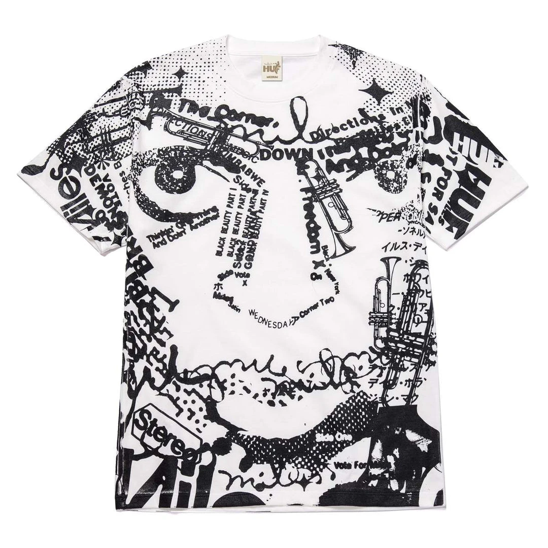 HUF x Miles Davis limited edition collaboration that pays homage to the acclaimed musician. Features an oversized photograph of the artist composed of album artwork on a classic white tee.