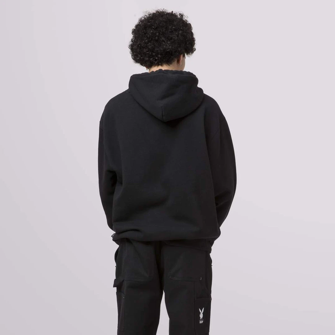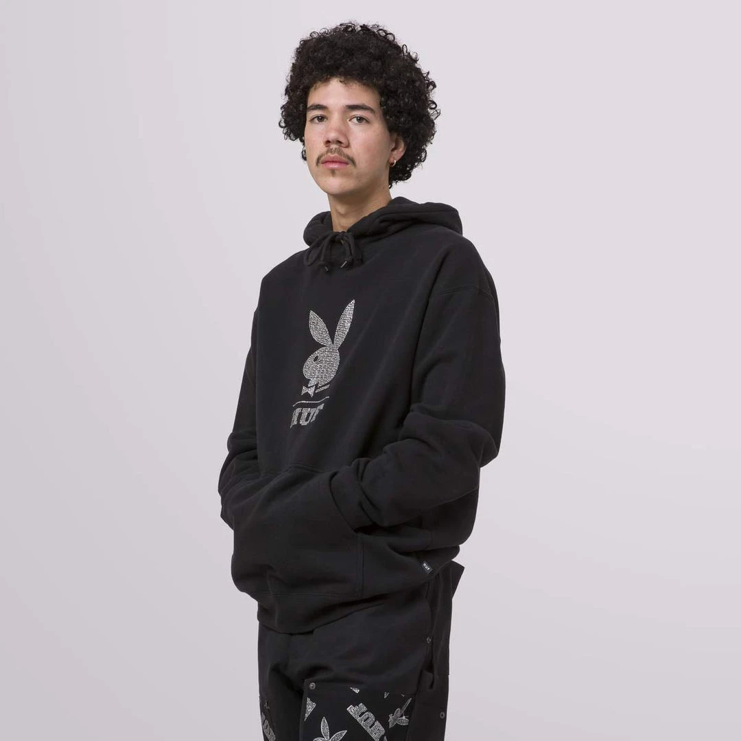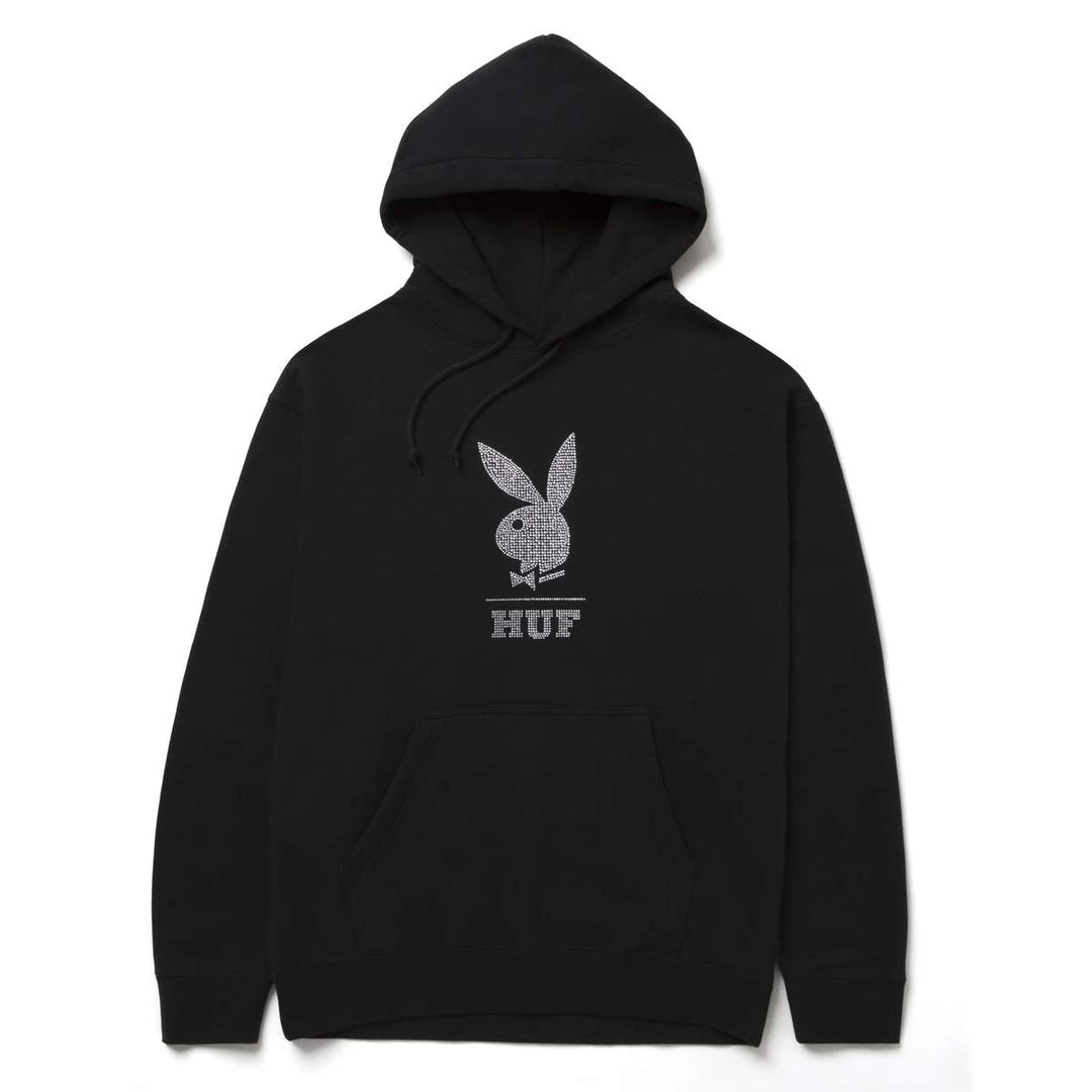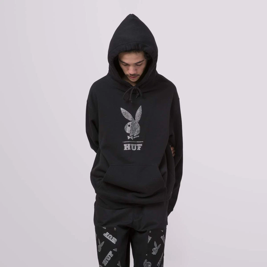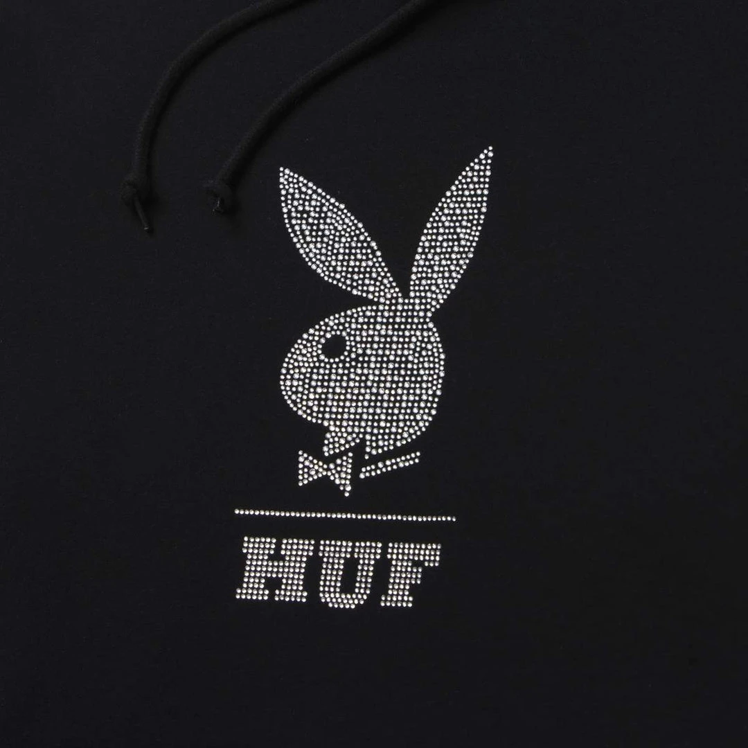 The HUF x Playboy “After Hours” Collection highlights the glitz and glamour of the iconic clubs. This limited edition heavyweight fleece hoodie features the legendary Rabbit Head logo in rhinestones. Kangaroo handwarmer pocket, double layer hood, and adjustable drawcord round out this blinged out hoodie.