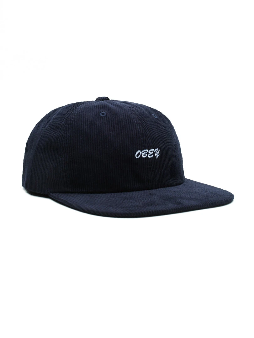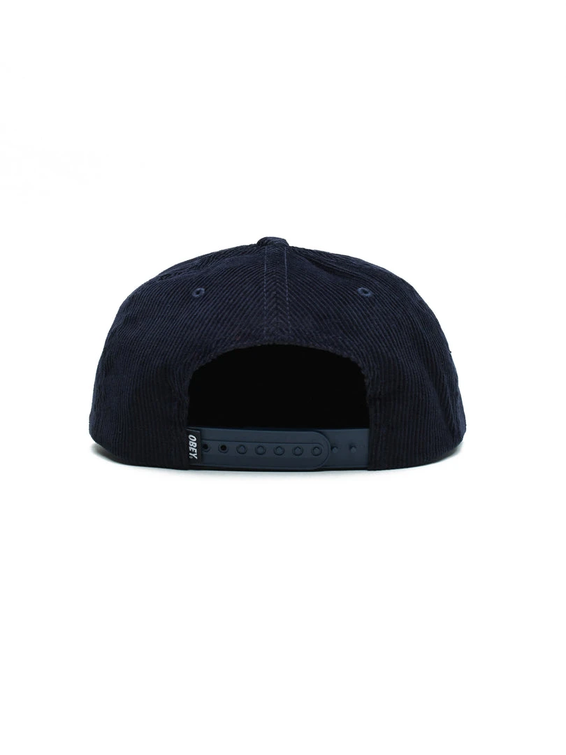 Mid profile navy corduroy strapback. Direct logo embroidery and adjustable plastic closure.