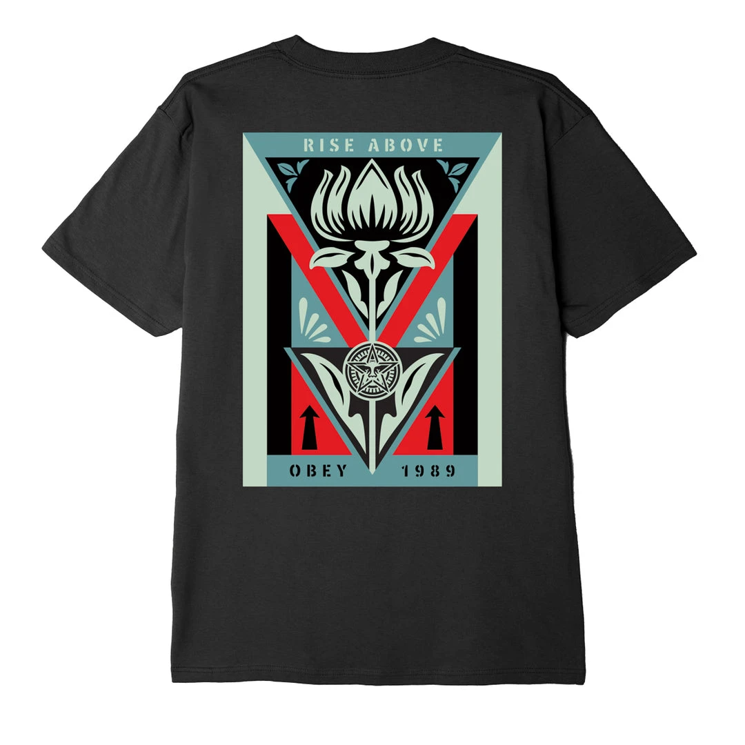 Black tee with small OBEY on the left chest and large Deco Flower back print that says, “Rise Above” with Obey 1989. Regular fit classic tee in heavyweight cotton jersey.