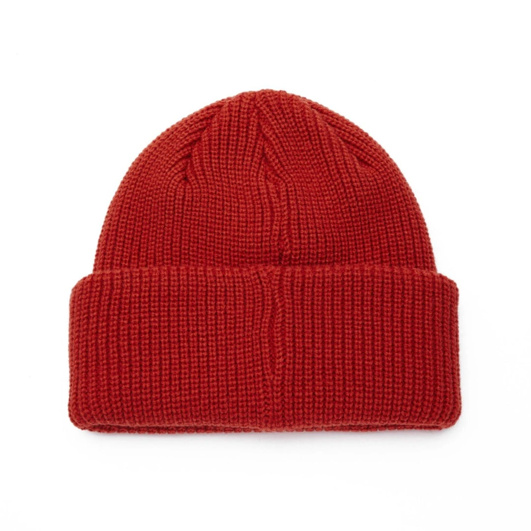 Ribbed knit beanie in hot sauce with shallow rolled cuff and direct logo embroidery.