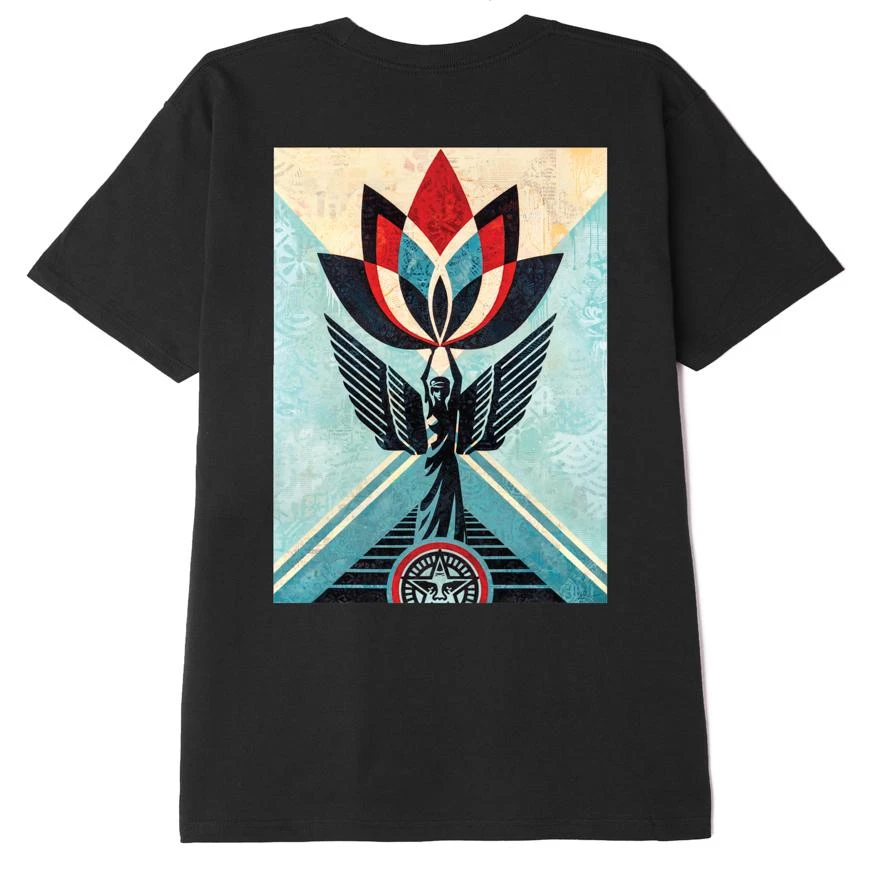 Created to inspire compassion and strength in the face of adversity. Proceeds from the original artwork was used as a fundraiser for COVID-19 relief in Los Angeles. Classic black tee with small OBEY on the left chest and lotus angel back print. Regular fit classic tee in heavyweight cotton jersey.