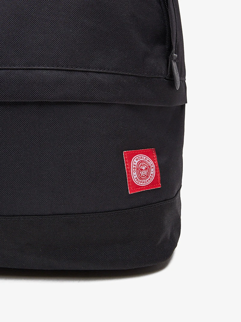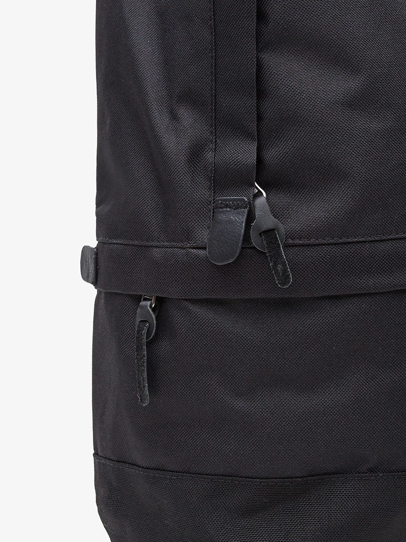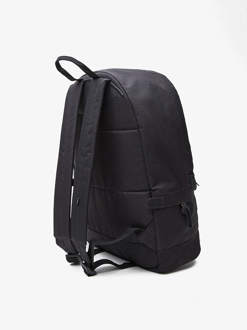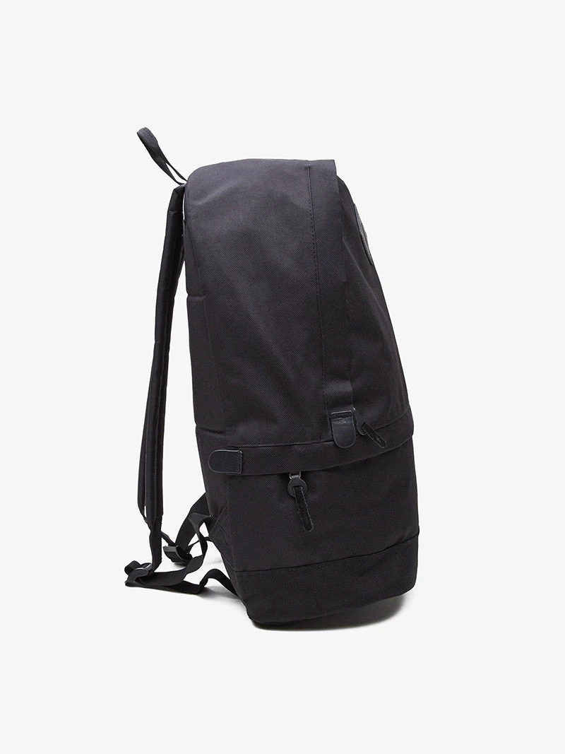 Black daypack with interior padded notebook sleeve with velcro closure. Features outside front pocket,chrome hardware, and leather zipper pulls.