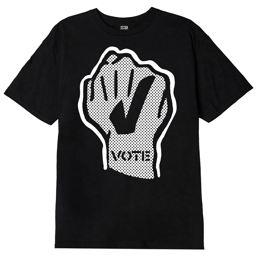 The raised fist has long served as Shepard Fairey’s hallmark symbol of rebellion. The clenched gesture signals strength and a call to action to vote. “No Tolerance For Ignorance” featured on the back of the shirt. Proceeds will be split between the ACLU and securing funds for billboards and producing pasters leading up to the November election. Part of the OBEY Awareness campaign.