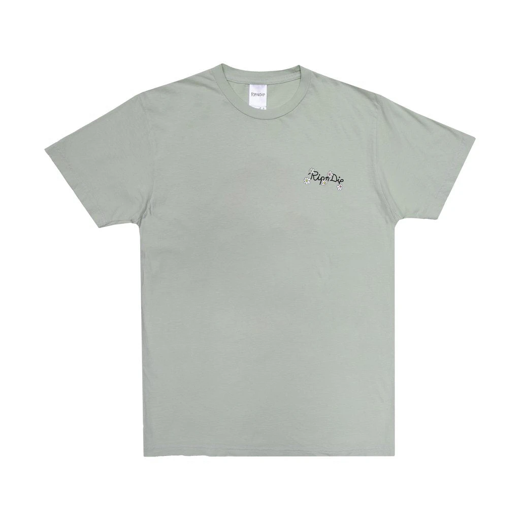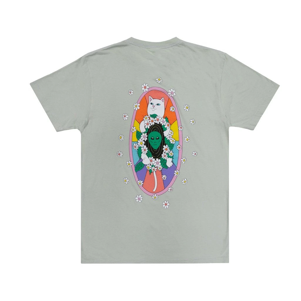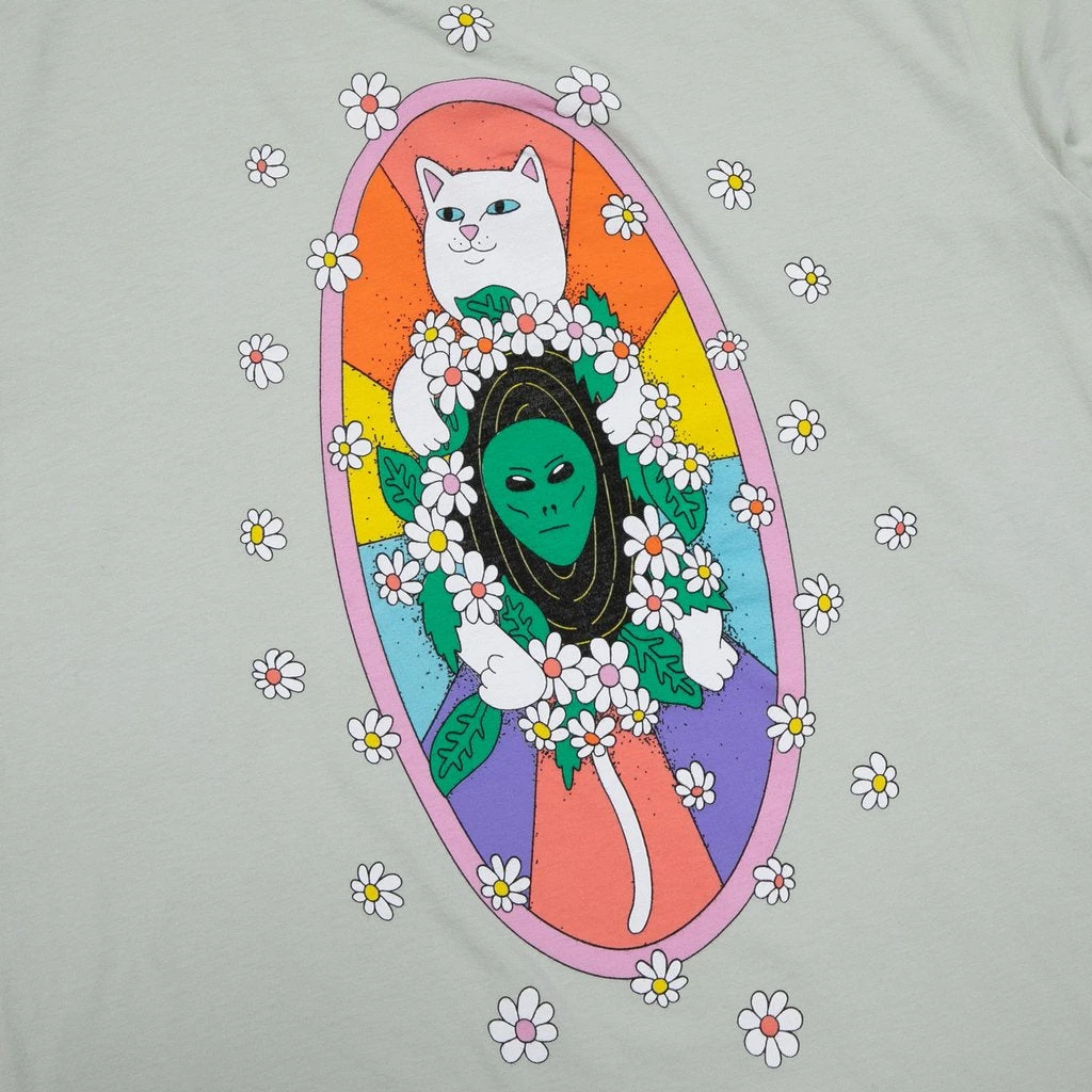 Together Nermal and Alien create a colorful work of art. Features Nermal and Alien against the backdrop of a rainbow tiles and daisies. RIPNDIP logo with daisies on the left chest of a pale sage tee.