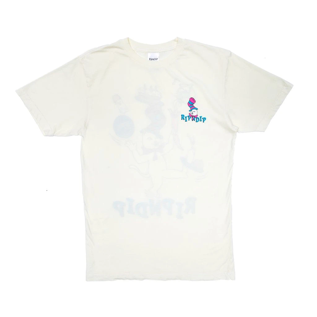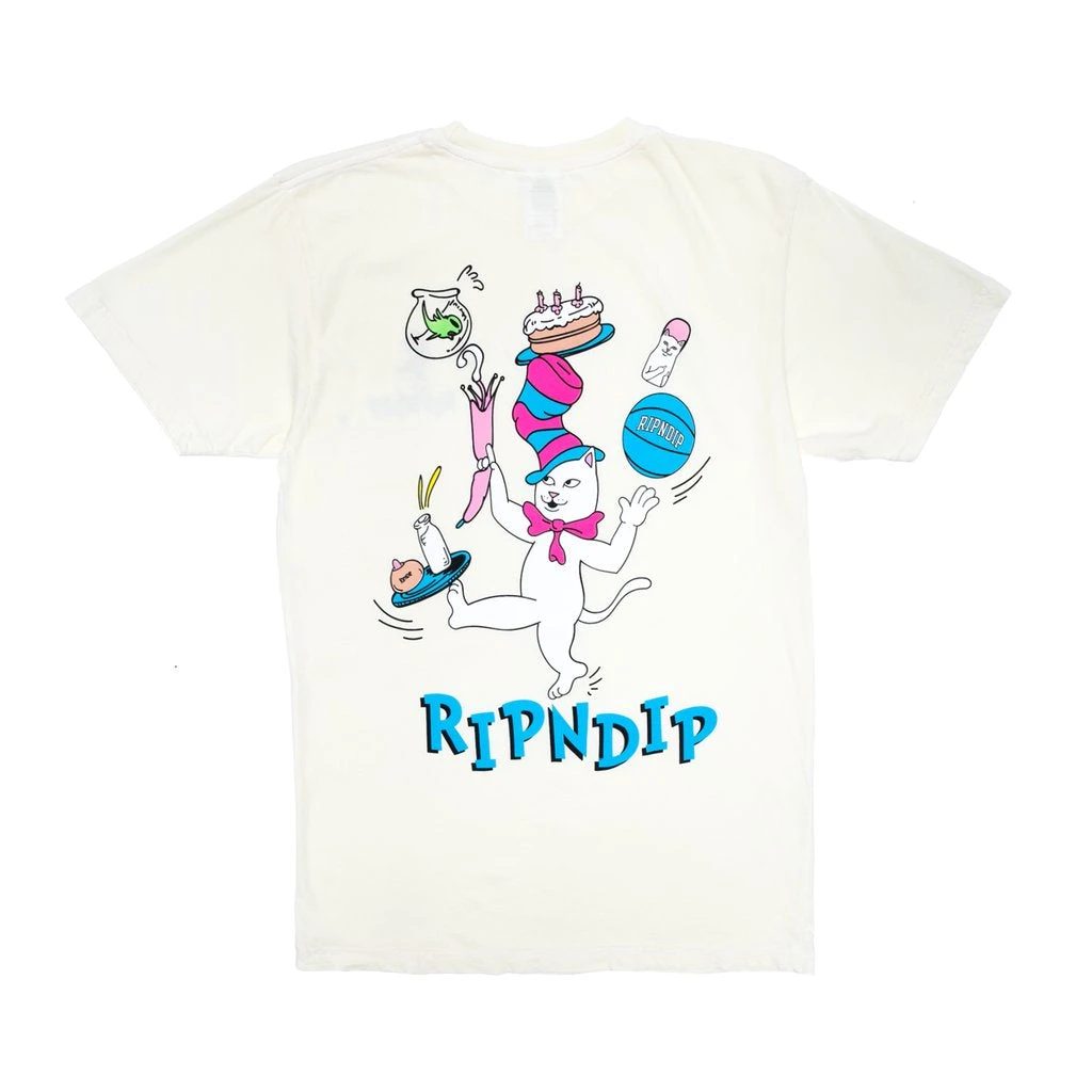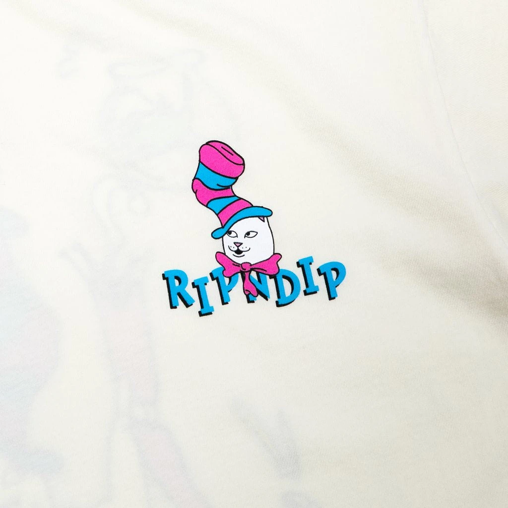 “My tricks are not bad, but that is not all.” RIPNDIP pays homage to a classic childhood character with a Nermal twist. Custom screen printed graphic featuring Nermal In The Hat juggling a bag of tricks.