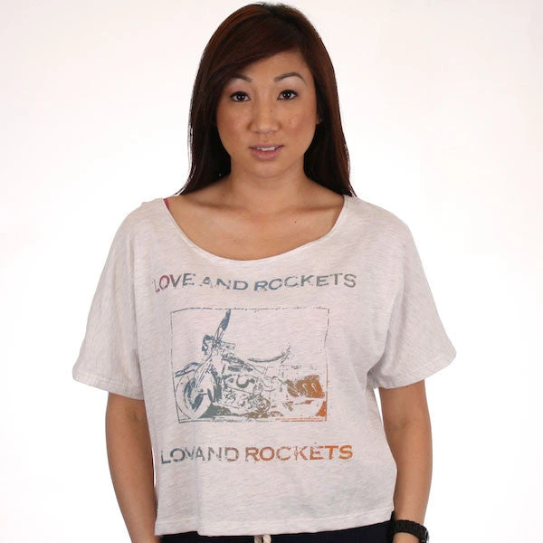 Mighty Fine Love & Rockets Women’s Shirt in Oatmeal Heather. Design is from Love & Rocket’s “Motorcycle” 12″ single. I feel speed…