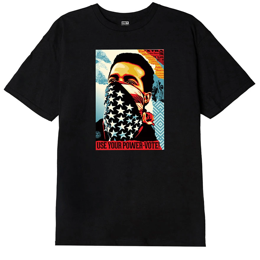 Original photo by Ted Soqui was taken in South Central on August 15, 2014 during a Black Lives Matter protest. Shepard Fairey reimagined the image to celebrate protest as a form of civic participation in democracy. Proceeds will be split between the ACLU and securing funds for billboards and producing pasters leading up to the November election. Part of the OBEY Awareness campaign.