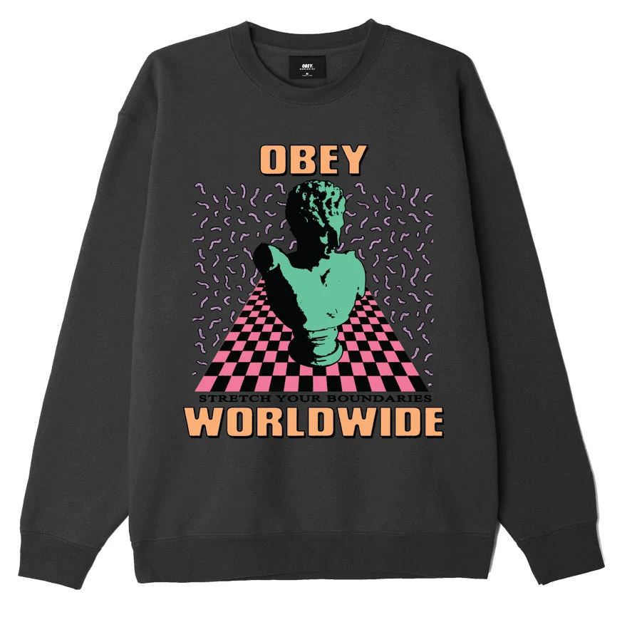“Obey Worldwide, Stretch Your Boundaries”. Regular fit heavyweight crewneck fleece with set in sleeves and solid rib trims. Features a specialty OBEY Worldwide vinyl heat transfer of a chess piece on a checkered board.