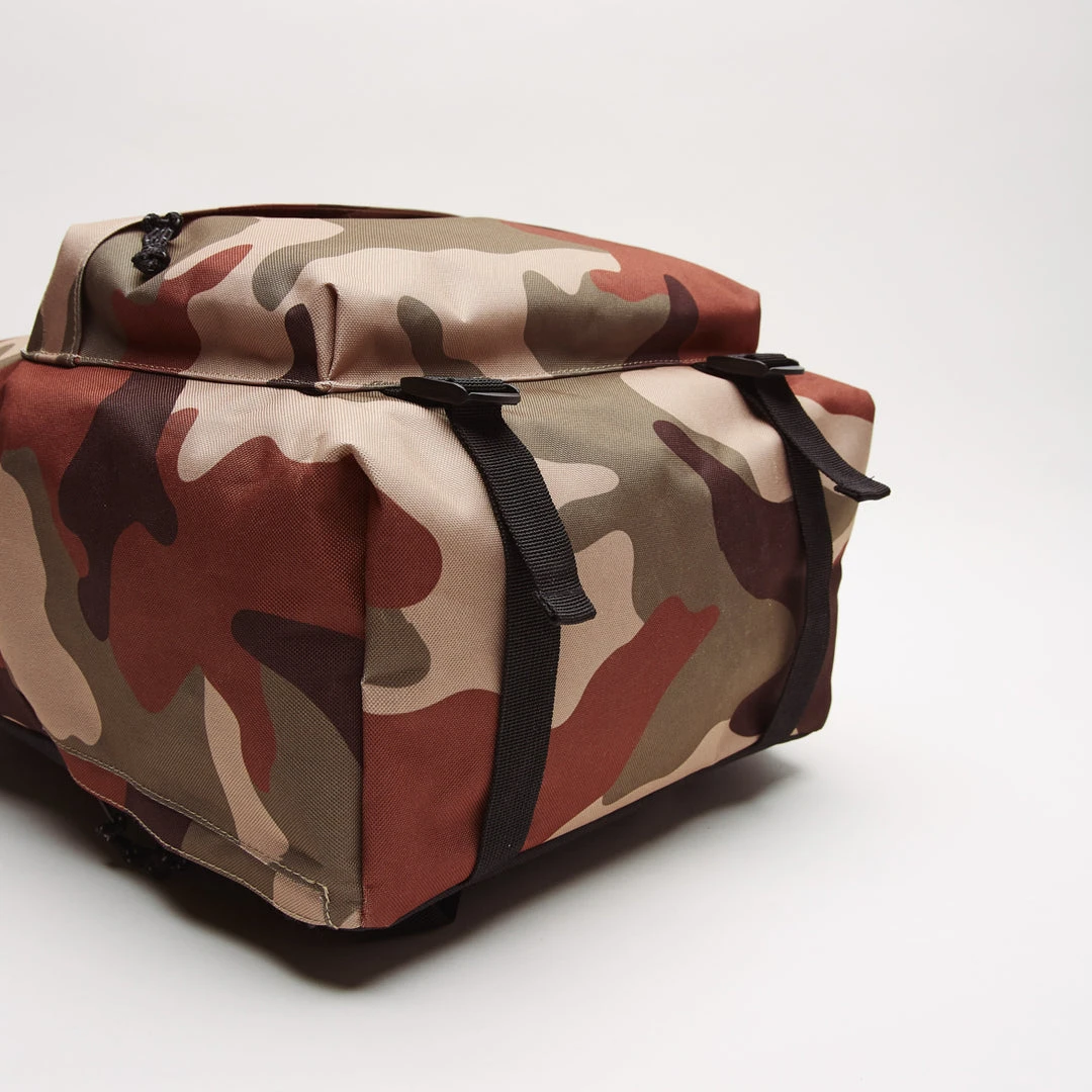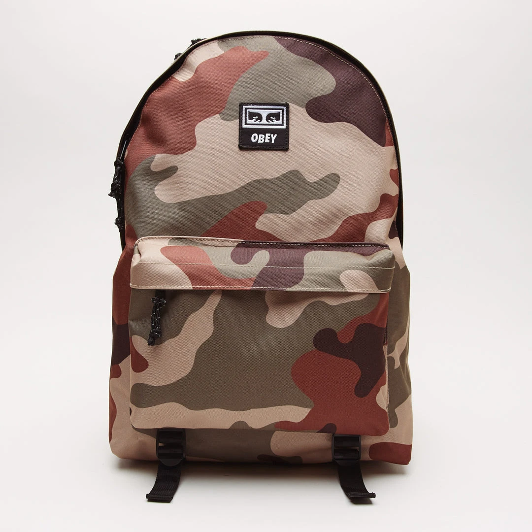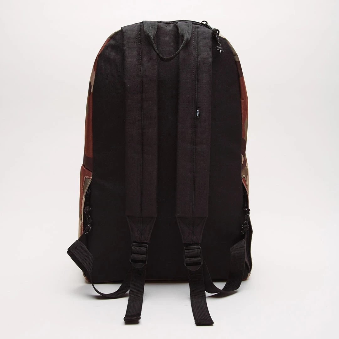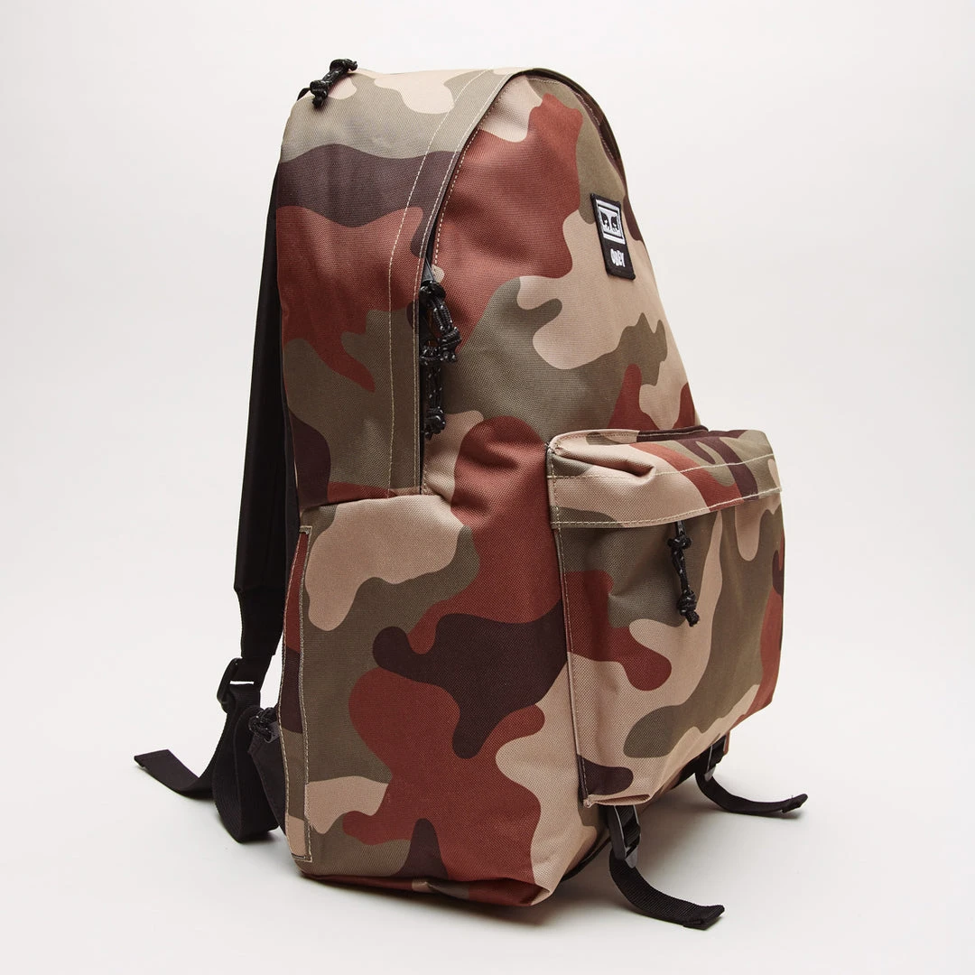 Day pack with large main zippered compartment and interior laptop sleeve. Features front zippered pocket, woven top handle, and padded shoulder straps. AReflective cord zipper pulls and woven logo patch.