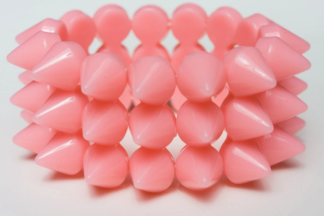 The Rainbow Starr Valentina bracelet features baby pink acrylic spikes on stretchy elastic. Bold, foxy and FUN!!! Looks extra cute when layered with other Rainbow Starr spike bracelets!!!