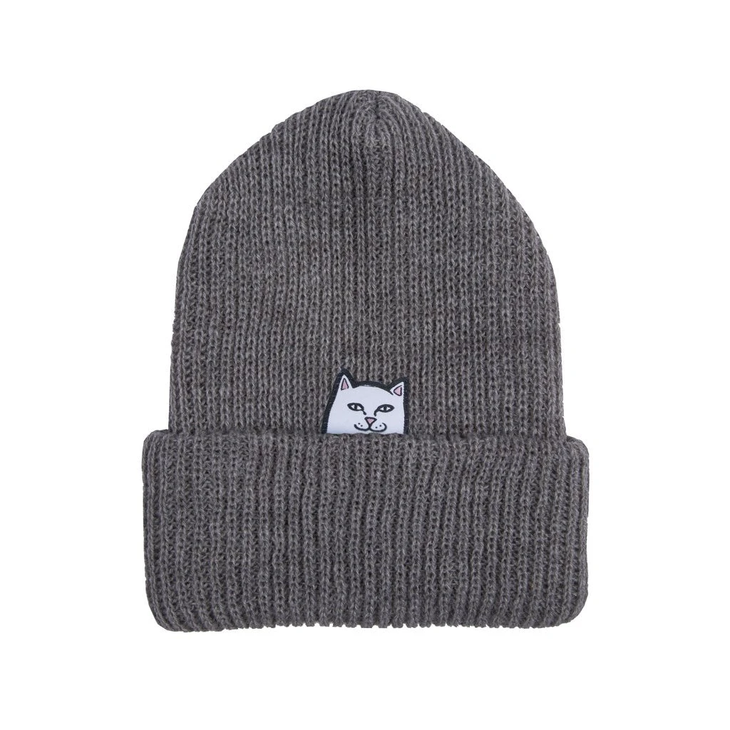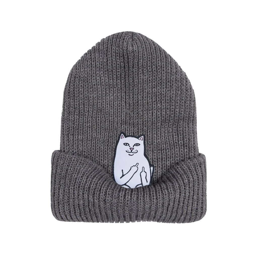 Ribbed acrylic beanie in gray. Features custom Nermal patch underneath the cuff.