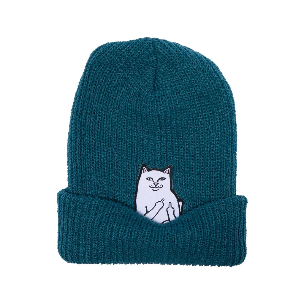 Ribbed acrylic teal beanie with custom Nermal patch underneath the cuff.