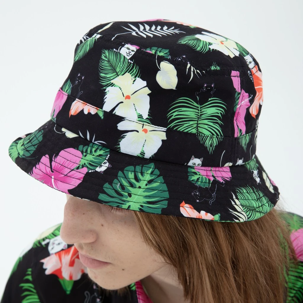 Get into the Aloha spirit with RIPNDIP’s bucket hat. Features Nermal and Jermal frolicking among the palm fronds and flowers.