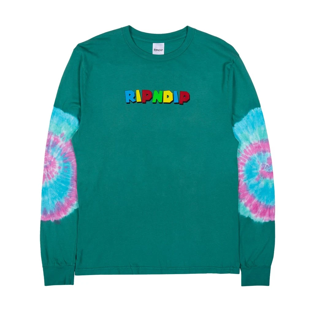 RIPNDIP nod to the world’s most famous Mario. RIPNDIP logo across the chest and Nermio graphic on the back. Custom aqua tie dye accents on the elbows.