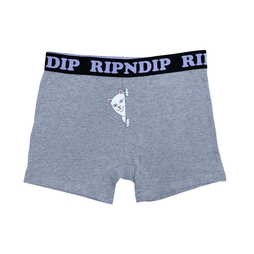 Nermal is front and center! Heather grey boxer briefs with RIPNDIP branded logo on elastic waistband.