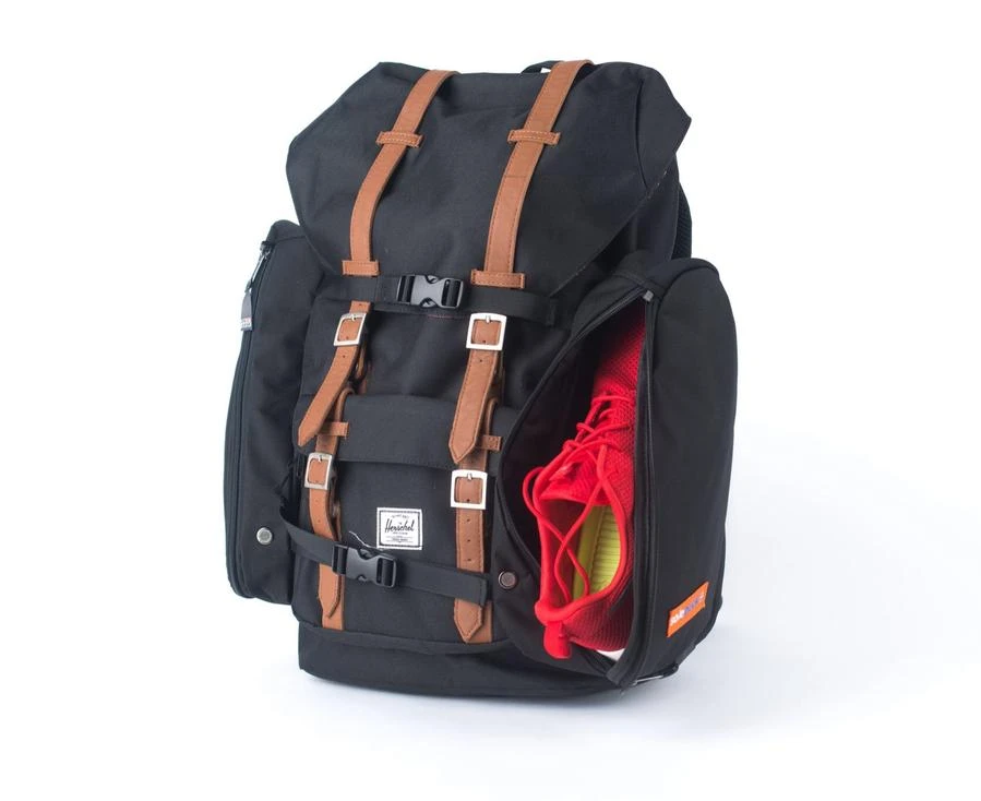 The SP-1 is an innovative backpack accessory for storing your kicks during travel. The dual compartments are made of a heavy duty ballistic poly blend and each have a neoprene sole that allows the bag expand to hold larger shoe sizes. The front and back adjustable straps allow you to wrap the bag around most backpacks. Each compartment has a strategically placed vent to provide ventilation and keep your shoes fresh.