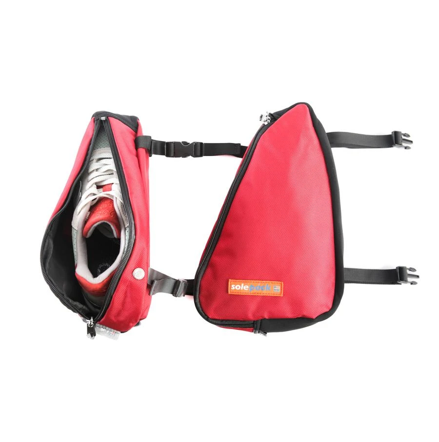 The SP-1 is an innovative backpack accessory for storing your kicks during travel. The dual compartments are made of a heavy duty ballistic poly blend and each have a neoprene sole that allows the bag expand to hold larger shoe sizes. The front and back adjustable straps allow you to wrap the bag around most backpacks. Each compartment has a strategically placed vent to provide ventilation and keep your shoes fresh.