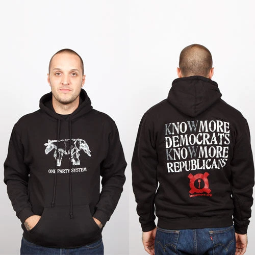 Sage’s commentary on the U.S. political system. A black hoodie featuring a front print that has a donkey & elephant merged as one and says, “One Pary System”. The back says, “KNOW MORE DEMOCRATS AND KNOW MORE REPUBLICANS”.