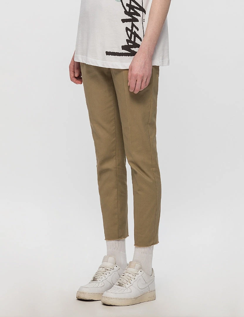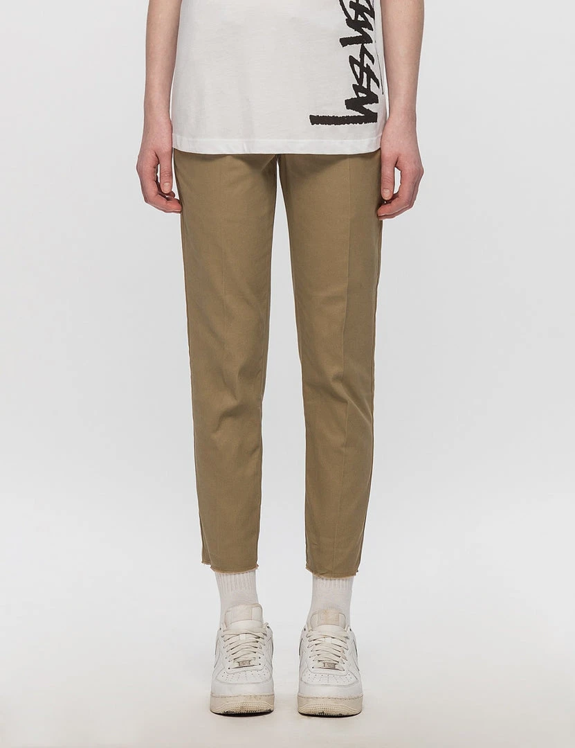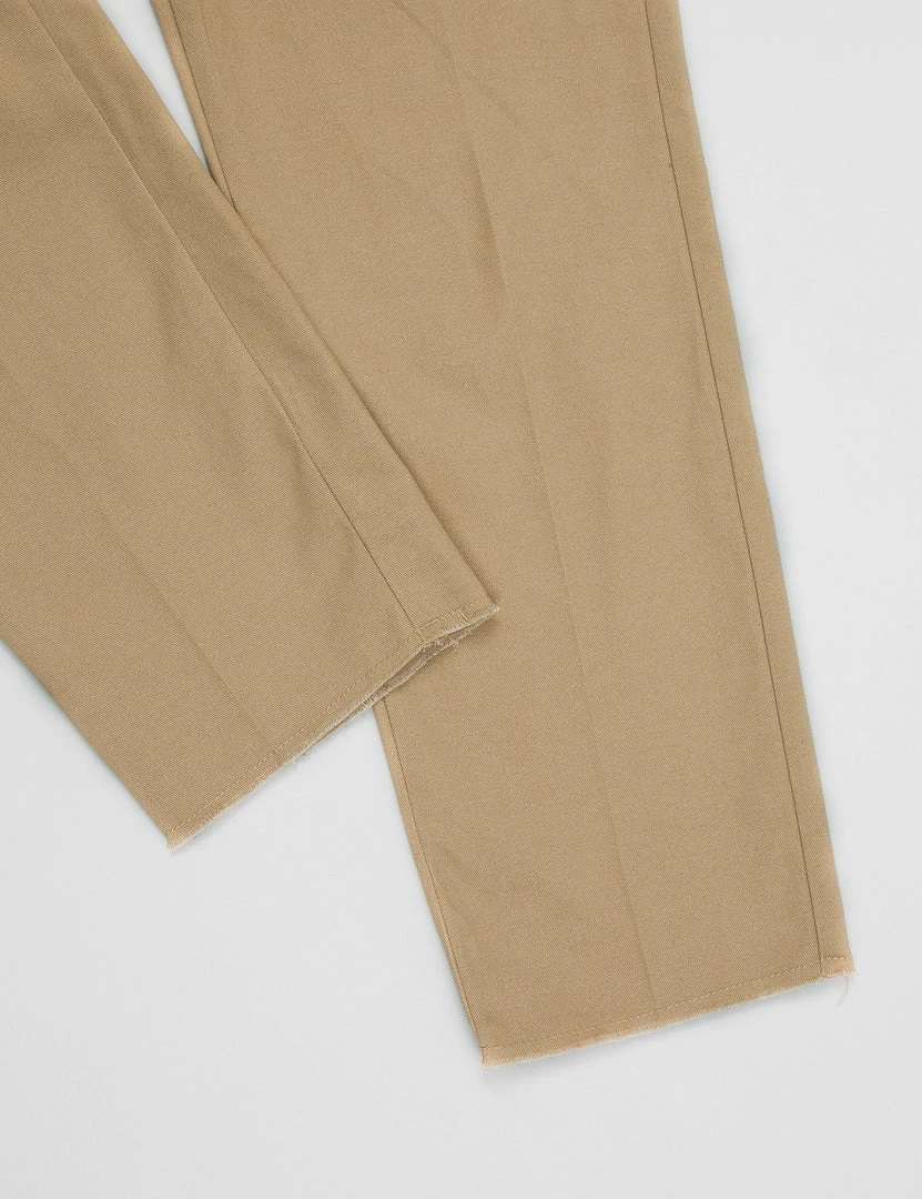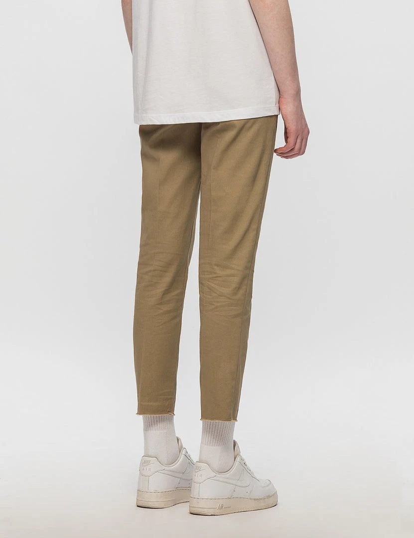 Slim fitting khaki pants with two front pockets and two back pockets. Small pleat in front. Raw unfinished hem.