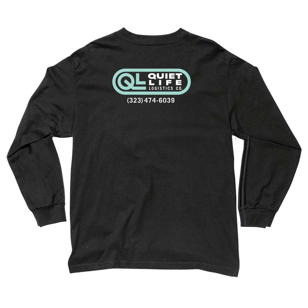 The Quiet Life Logistics team is going with the flow and keeping it moving. Screen printed logo graphic on left chest and across the back of a classic black long-sleeve tee.