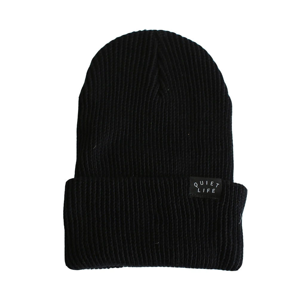 Understated and classic black beanie from The Quiet Life. Medium gauge cuffed beanie with custom logo clip label.