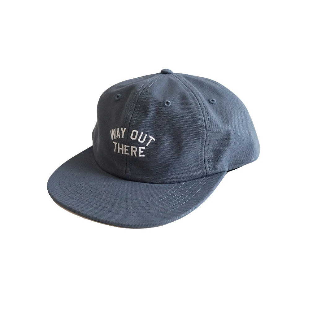 Brushed cotton twill fabric with custom “Way Out There” embroidery. Adjustable leather back strap.