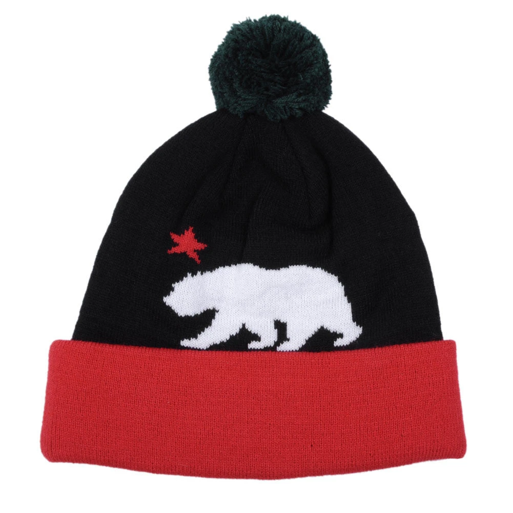 TRUE Cali Bear Pom Beanie in black. California state flag design in a soft acrylic knit.
