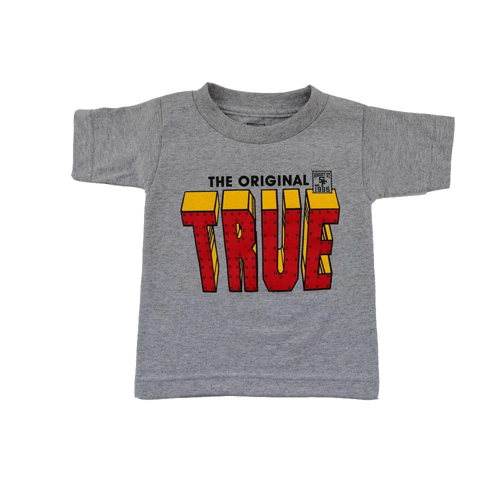 The Original TRUE in block lettering on a heather grey kids tee. Haight Street SF Est. 1996 stamp on left chest.