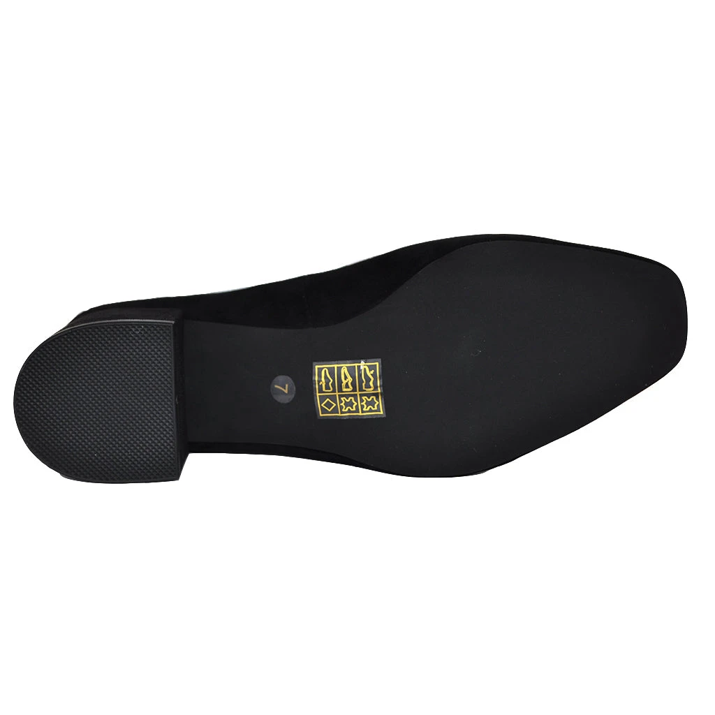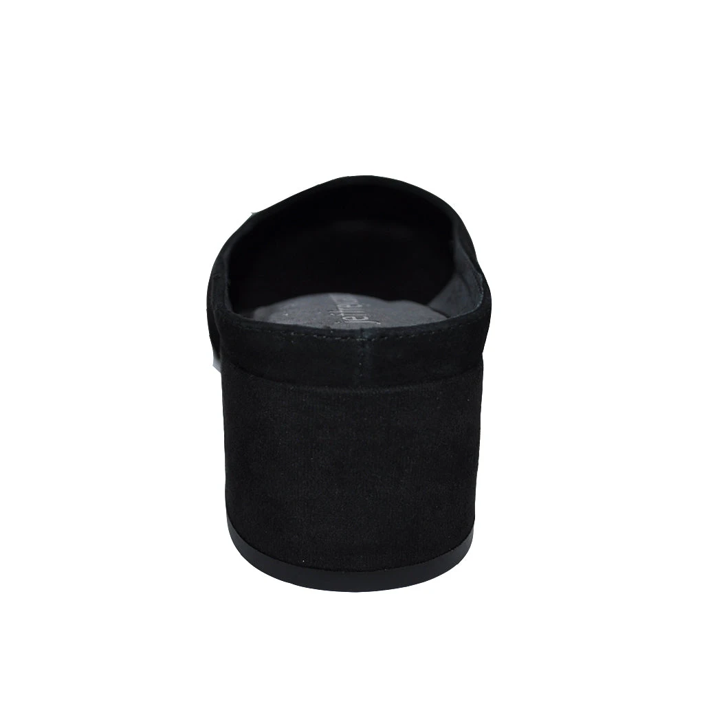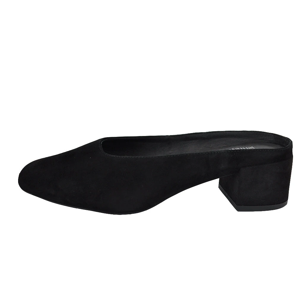 Black suede mules with slightly squared toe.