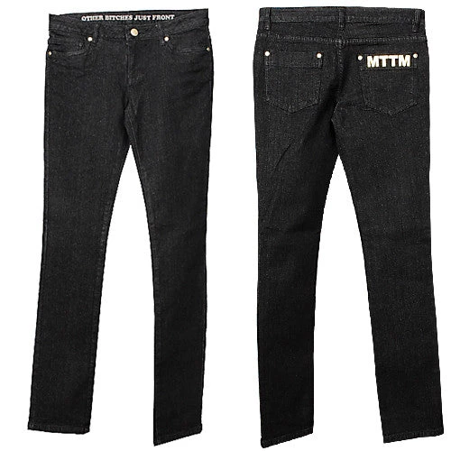 Perfect black jeans. The right rear pocket says, “MTTM” and the inner waistband says, “Other bitches just front”.