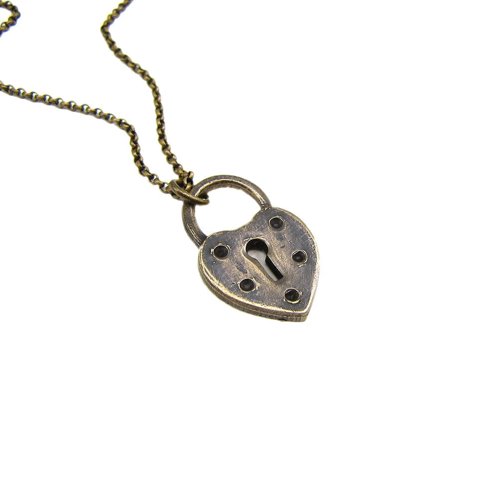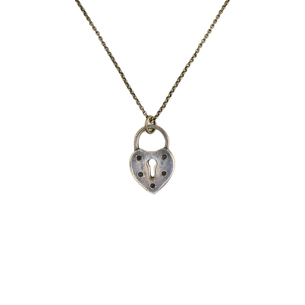 Keep your heart under lock and key. Heart lock pendant on 18″ aged brass chain. Heart measures approximately 1/2″ across.